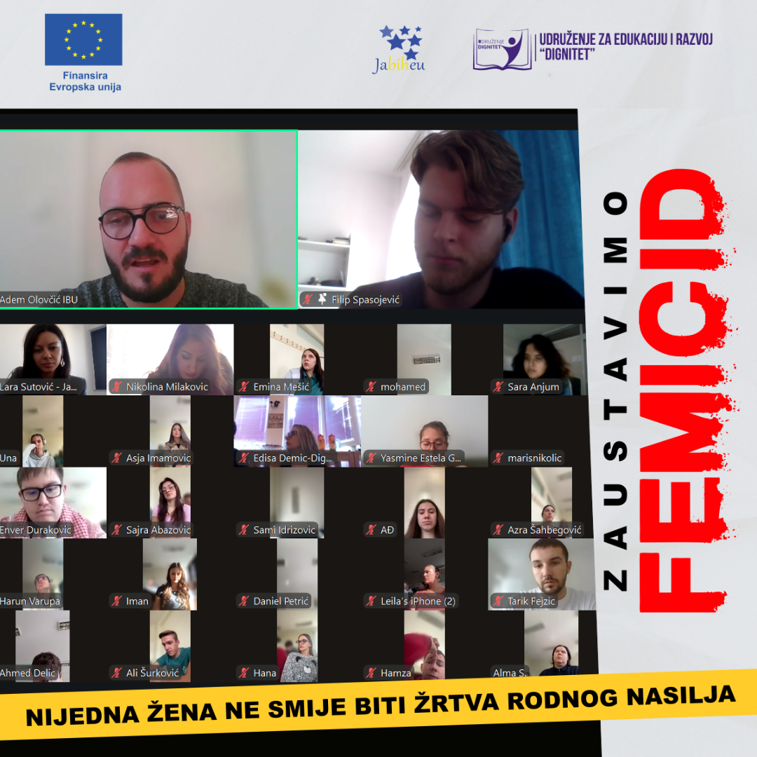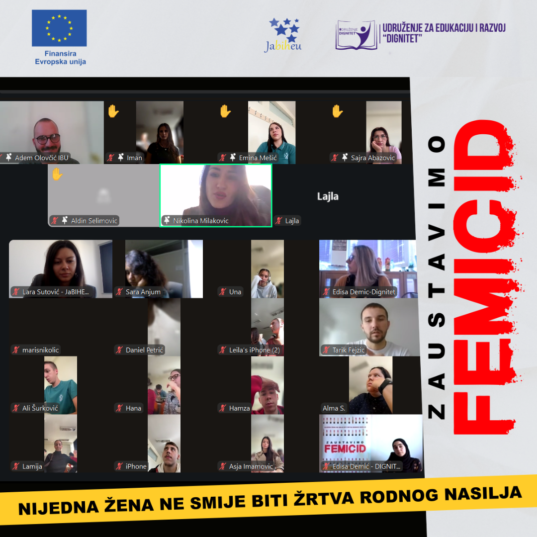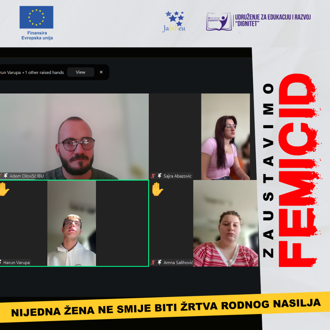 Udruženja JaBiHEU i Dignitet, uz finansijsku podršku Evropske unije, provode projekat „Unapređenje pravne i društvene matrice za sprečavanje femicida i rodno zasnovanog nasilja u BiH“. Cilj projekta je unapređenje pravnog i institucionalnog okvira za prevenciju i suzbijanje femicida i drugih oblika rodno zasnovanog nasilja u Bosni i Hercegovini kroz zagovaranje efikasnijih javnih politika, multisektorsku saradnju i jačanje kapaciteta relevantnih aktera. Kroz niz aktivnosti, uključujući analize pravnih okvira, javne diskusije i stručne radionice, projekat doprinosi boljem razumijevanju ključnih izazova i potrebi za sistemskim rješenjima u ovoj oblasti.